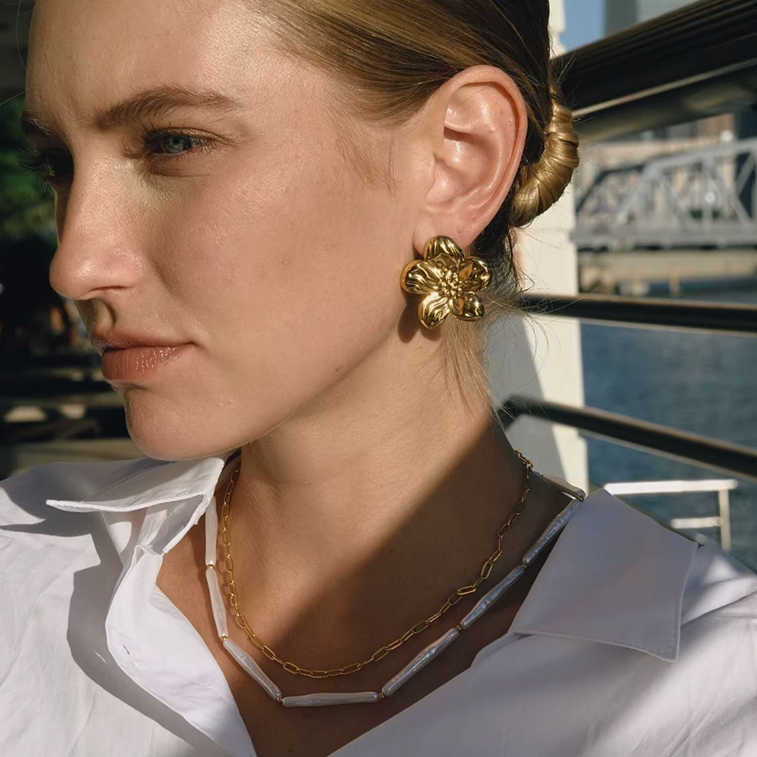 Elevate your look with the Flore Gold Floral Earrings, designed to make a refined statement. These intricately crafted earrings feature a delicate floral motif in a luminous gold finish, adding a touch of sophistication to any ensemble. Perfect for both special occasions and daily wear, they bring graceful charm and timeless beauty to your look.