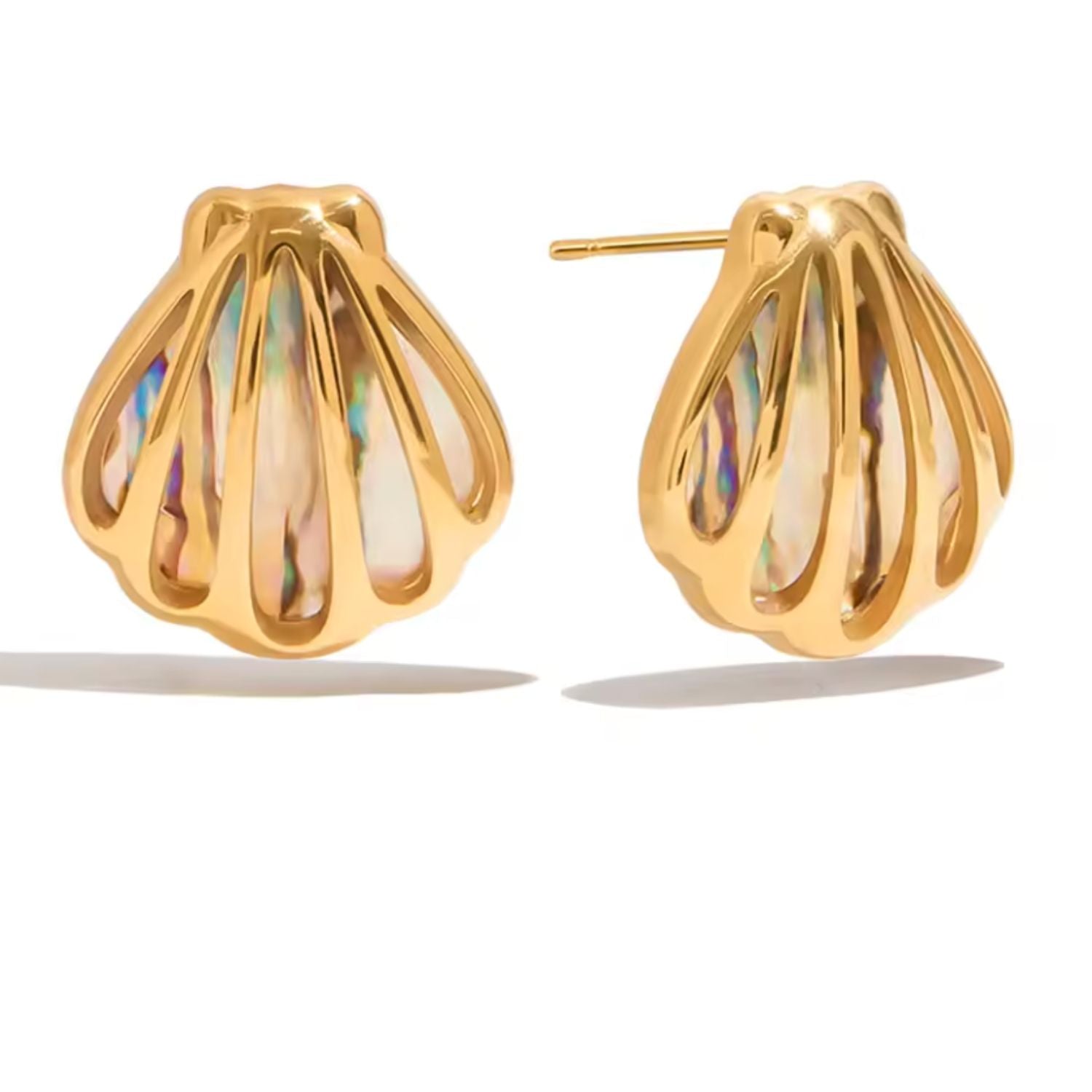 Delicate seashell fragments are suspended within an intricate gold cage, creating an elegant statement piece that captures the essence of coastal luxury. These earrings blend natural beauty with refined metalwork, offering a sophisticated accessory that transitions seamlessly from day to evening wear.
